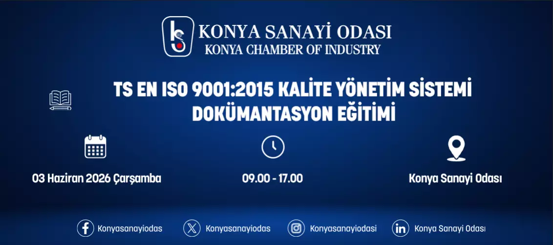 Konya Sanayi Odası, 3 HAZİRAN 2026 ÇARŞAMBA Saat 09:00- 17:00 da " TS EN ISO 9001:2015 Kalite Yönetim Sistemi Dokümantasyon Eğitimi 3 HAZİRAN 2026" düzenleyecektir.