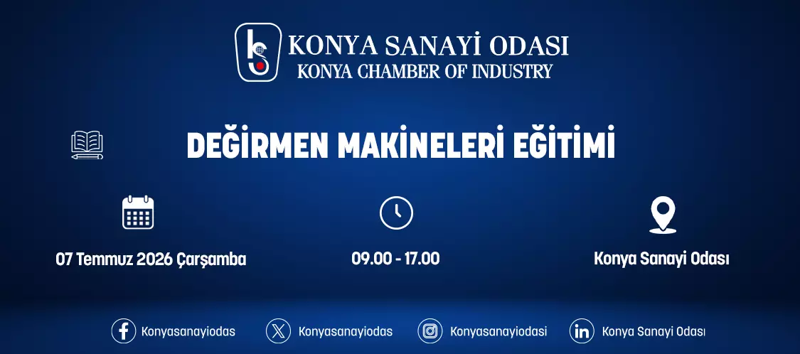 Konya Sanayi Odası, 7 TEMMUZ 2026 ÇARŞAMBA Saat 09:00- 17:00 da " DEĞİRMEN MAKİNELERİ Eğitimi " düzenleyecektir.