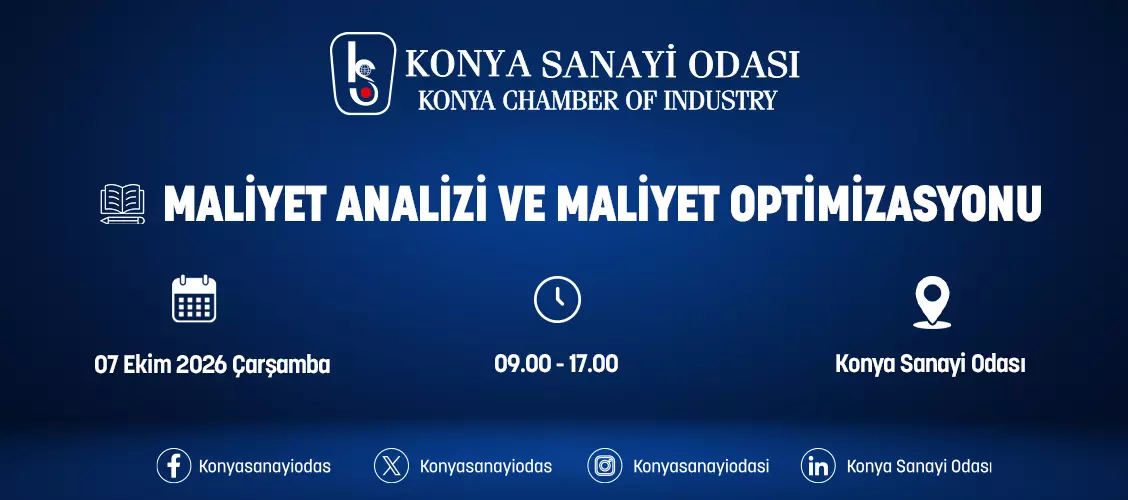 Konya Sanayi Odası, 7 EKİM 2026 ÇARŞAMBA Saat 09:00- 17:00 da " Maliyet Analizi ve Maliyet Optimizasyonu Eğitimi " düzenleyecektir.