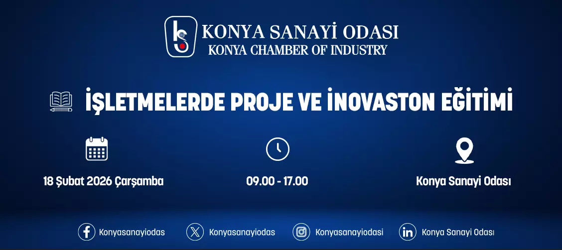 Konya Sanayi Odası, 18 ŞUBAT 2026 ÇARŞAMBA Saat 09:00- 17:00 da " İşletmelerde Proje Ve İnovasyon Yönetimi EĞİTİMİ " düzenleyecektir.