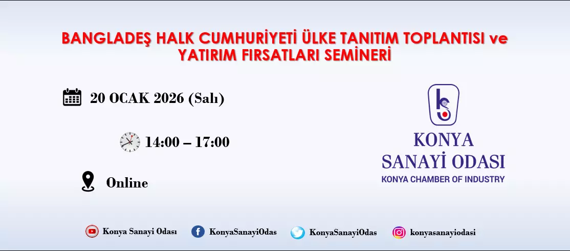 Konya Sanayi Odası olarak, Bangladeş Konya Fahri Konsolosu iş birliğiyle, 20 Ocak 2026 Salı saat: 11:00-12:0’da Bangladeş’teki yatırım fırsatlarının ele alınacağı “BANGLADEŞ ÜLKE TANITIM TOPLANTISI ve YATIRIM FIRSATLARI SEMİNERİ” düzenlenecektir. Seminer dili İngilizcedir. Türkçe çeviri desteği sağlanacaktır.