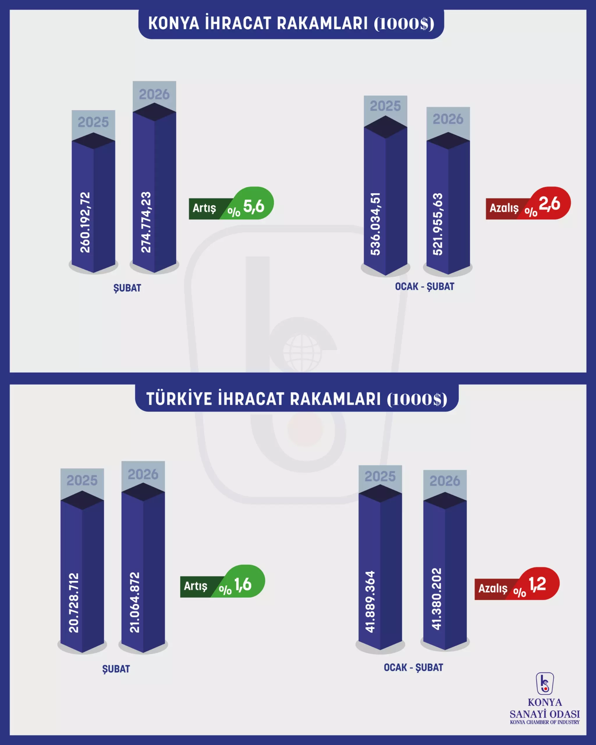 Konya, Şubat ayında ihracatını yüzde 5,6 artırarak, aylık bazda 274 milyon 774 bin dolar ihracat gerçekleştirdi. İhracat rakamlarını değerlendiren Konya Sanayi Odası (KSO) Başkanı Mustafa Büyükeğen, Konya’nın Ocak ayı ihracatında yaşanan düşüşün ardından Şubat ayındaki yüzde 5,6’lık ihracat artışının memnuniyet verici olduğunu ifade etti. Büyükeğen, şunları söyledi: “Konya’mız ihracatını Şubat ayında yüzde 5,6 artırarak 274 milyon 774 bin dolar ihracat yaptı. Şubat ayında Türkiye ortalaması olan yüzde 1,6’nın çok üzerinde bir artış yakalayan Konya’mız böylece Ocak-Şubat döneminde 521 milyon 955 bin dolar ihracat gerçekleştirmiş oldu. Tüm zorlu şartlara rağmen üretim ve ihracat azmini sürdüren Konyalı sanayicilerimizi ve çalışanlarımızı kutluyorum.”