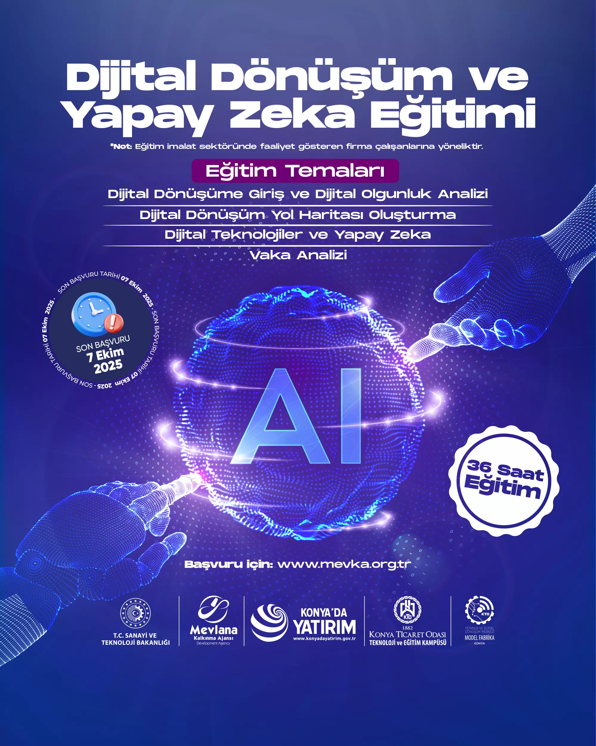 Bilindiği üzere Mevlana Kalkınma Ajansı, Sanayi ve Teknoloji Bakanlığı Koordinasyonunda Konya ve Karaman illerinde, bölgesel kalkınma alanında faaliyetler yürüten bir kamu kurumudur. Mevlana Kalkınma Ajansı, Konya Yatırım Destek Ofisi aracılığıyla iş ve yatırım ortamının iyileştirilmesine yönelik çalışmalar yürütmektedir. Bu kapsamda Mevlana Kalkınma Ajansı tarafından ilimiz için önemli olduğu değerlendirilen imalat sektöründe faaliyet gösteren firmaların çalışanlarına yönelik Dijital Dönüşüm ve Yapay Zeka Eğitim Programı düzenlenecektir.