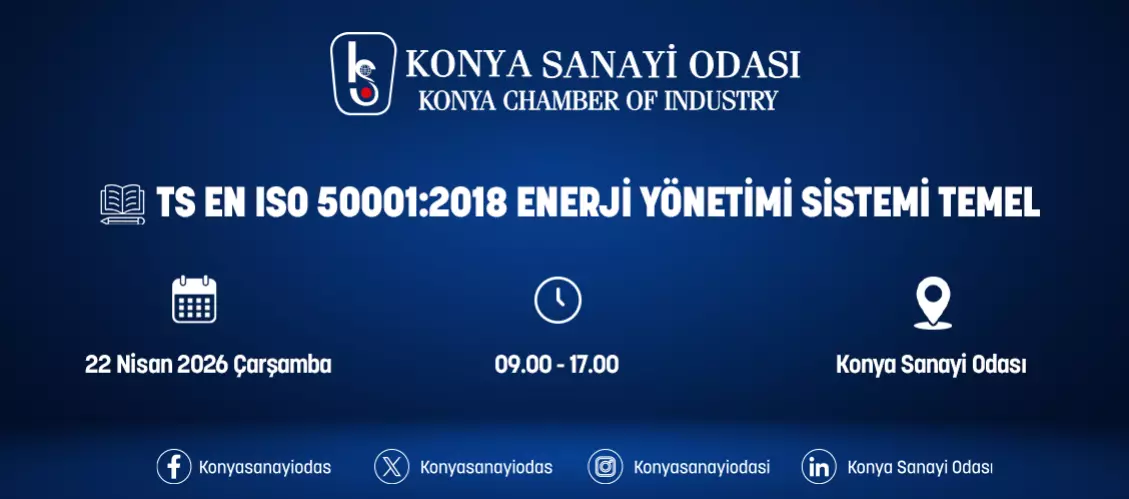 Konya Sanayi Odası, 22 NİSAN 2026 ÇARŞAMBA Saat 09:00- 17:00 da " TS EN ISO 50001:2018 Enerji Yönetimi Sistemi Temel Eğitimi 22 NİSAN 2026" düzenleyecektir.