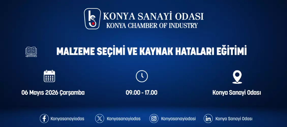 Konya Sanayi Odası, 6 MAYIS 2026 ÇARŞAMBA Saat 09:00- 17:00 da " MALZEME SEÇİMİ VE KAYNAK HATALARI Eğitimi " düzenleyecektir.