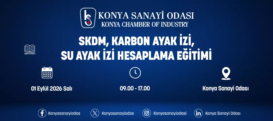 SKDM, KARBON AYAK İZİ, SU AYAK İZİ HESAPLAMA EĞİTİMİ Etkinlik Başlangıcı 01 Eylül 2026 09:00 Etkinlik Bitişi 01 Eylül 2026 17:00 Konum Konya Sanayi Odası Etkinliğe Katılmak İçin Lütfen Tıklayın! Sayın Üyemiz, Konya Sanayi Odası, 1 EYLÜL 2026 SALI Saat 09:00- 17:00 da " SKDM, Karbon Ayak izi, Su Ayak izi Hesaplama ve Bilgilendirme Eğitimi " düzenleyecektir. Not: Eğitim 10 kişiyi geçtiği takdirde gerçekleştirilecektir. Eğitim 10 kişiyi geçtiğinde katılımcılara e mail ile bilgi verilecektir.