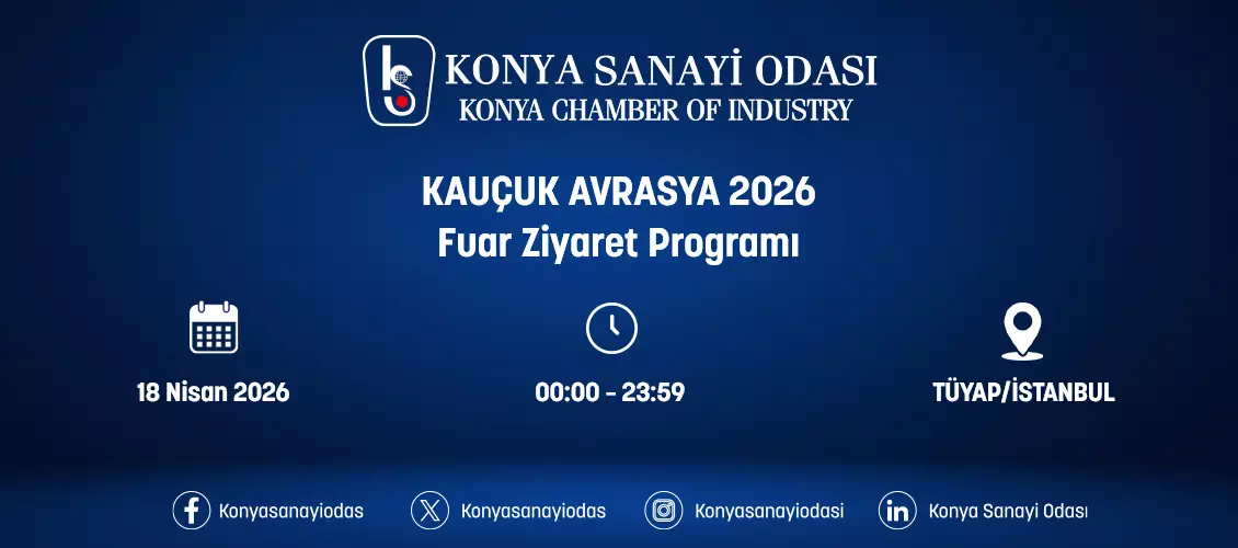 Konya Sanayi Odası olarak, 15-18 Nisan 2026 tarihinde TÜYAP/İSTANBUL’da düzenlenecek olan Kauçuk Avrasya 2026 fuarına ziyaret programı organize edilecektir.
