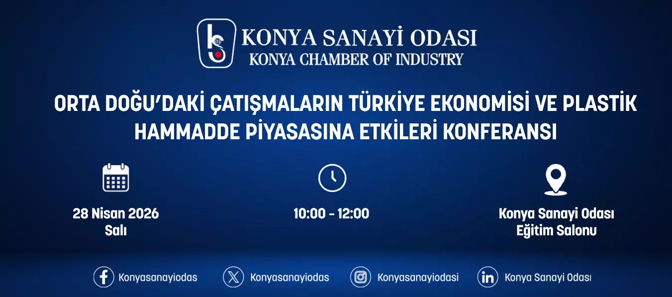 28 Nisan 2026 tarihinde saat 10.00’da Dr. Mevlüt Çetinkaya tarafından Konya Sanayi Odasında ‘‘Orta Doğu’daki Çatışmaların Türkiye Ekonomisi ve Plastik Hammadde Piyasasına Etkileri’’ adlı konferans düzenlenecektir.