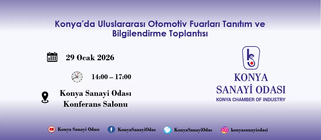 Konya Sanayi Odası olarak, 29 Ocak 2026 Perşembe saat 14:00–17:00’da “Konya'da Uluslararası Otomotiv Fuarları Tanıtım Bilgilendirme Toplantısı gerçekleştirilecektir.